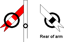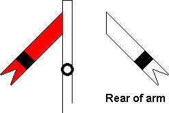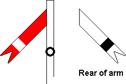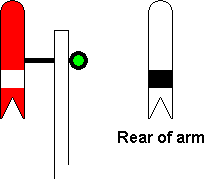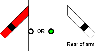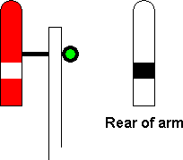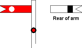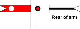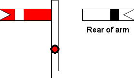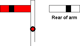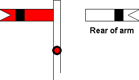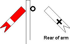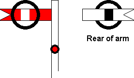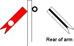 The Midland Railway's distant signals were notable for having a black band along the middle of the rear side of the arm [2.29 & 2.30]. Some distant signals on the Central Division of the North Eastern Railway had a black cross on the rear of the arm [2.31 & 2.32].